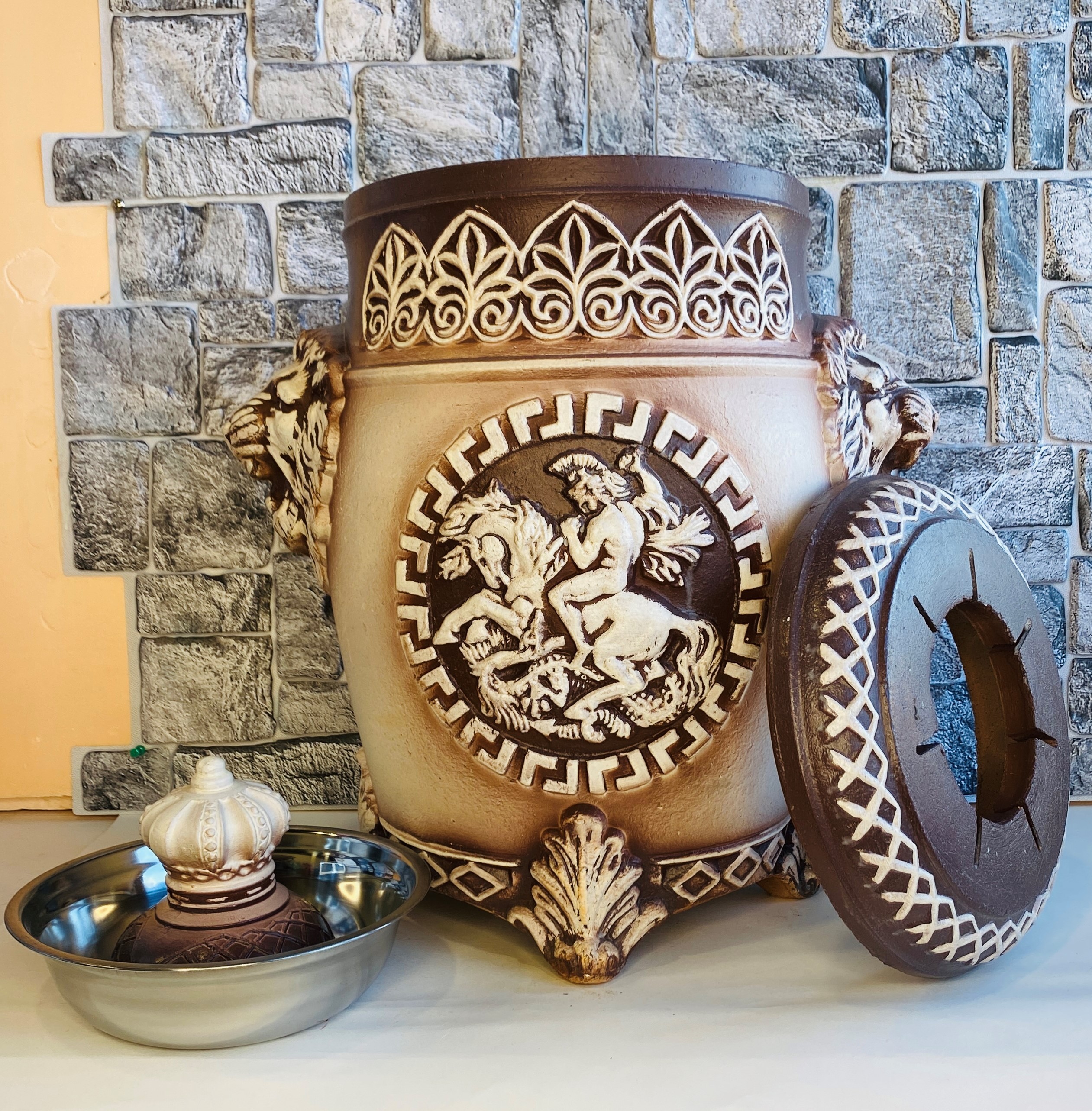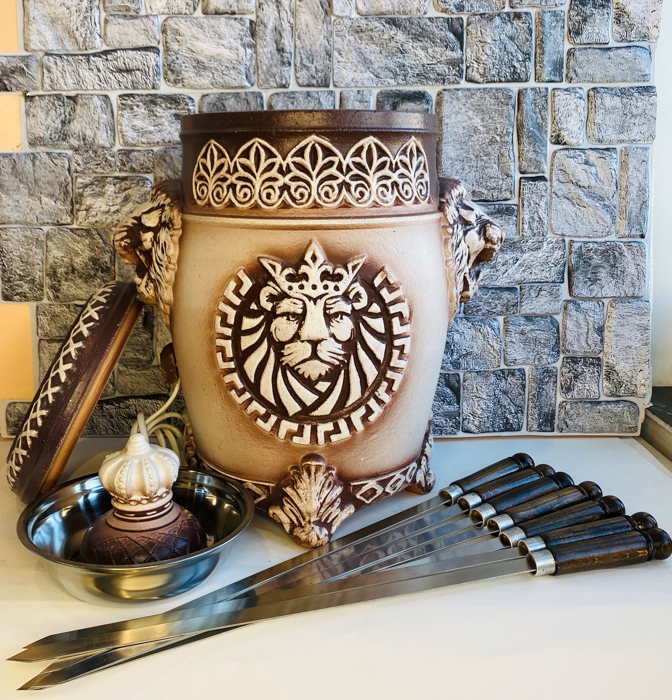 Թոնիր 7 շիշ <<ԱՌՅՈՒԾ>>։ Մի կողմում պատկերված է առյուծ, հակառակ կողմում՝ ձիավոր։ Քաշը՝ 19-21 կգ։ Ներսի աշխատող մասը՝ 47 սմ։ Բարձրությունը կափարիչի հետ՝ 65 սմ։ Բարձրությունը շամփուրների հետ՝ 73 սմ։ Տրամագիծը՝ 31 սմ։ Բերանի տրամագիծը՝ 12 սմ։ Բռնակների հեռավորությունը՝ 46 սմ։ Հզորությունը՝ 2․2 կվ/ժ։ Նախատեսված է 4-5 կգ խորովածի համար։ Կափարիչի բռնակը՝ կավե թագ։ Կարելի է օգտագործել ցանկացած տեսակի հատակի վրա (գորգ, մանրահատակ․․․) ի շնորհիվ հատուկ ոտիկների։ Գնի մեջ ներառված է 7 շամփուր՝ լաքապատ բռնակով և յուղերի (ավելորդ հեղուկի) կավե թաս։ Գինը առանց շամփուրների 31 900 — 7 Х 1200դր։ Գործում է առաքում։