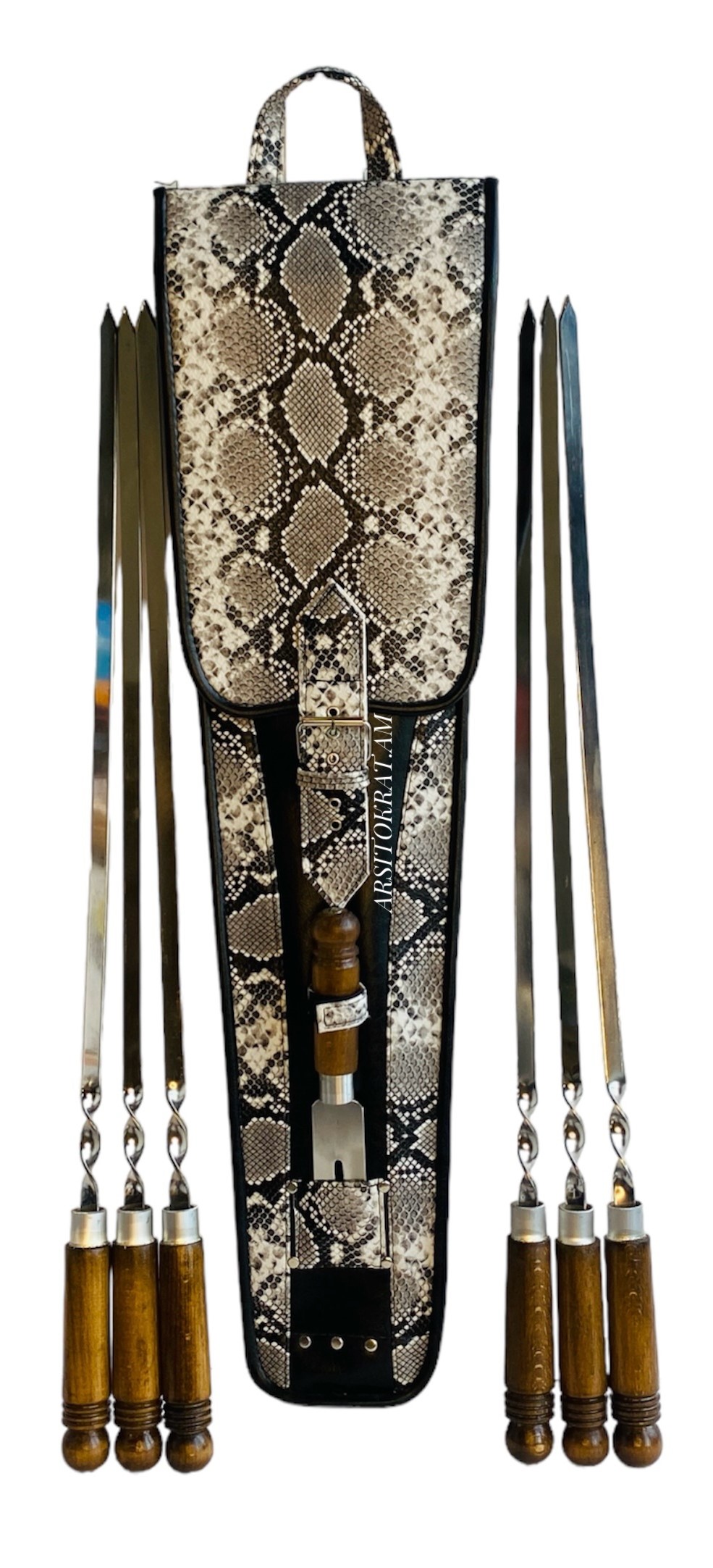 Հավաքածուի մեջ ներառված է կաշվին փոխարինող (արհեստական սպիտակ օձի կաշի) որակյալ նվերային պատյան՝ 22*5*87սմ, քաշը՝ 600գ, գույնը՝ սպիտակ-սև։ Պատյանը ունի կաշվե բռնակ, նաև հարմար է մեքենայով տեղափոխելիս։ Շամփուրները 6 հատ են, քաշը՝ 200գ, ներառված է նաև երկսայր դանակ (вилка), քաշը՝ 100գ։ Հավաքածուի ընդհանուր քաշը՝ 1800գ։ Շամփուրի բռնակը՝ 16սմ, փայտե լաքապատ է, ալյումինե կոլցոյով, աշխատող հատվածը 50սմ է, մաքուր չժանգոտվող ներժից է՝ հաստությունը՝ 2,5մմ, լայնությունը՝ 1,5սմ, ծայրը սրված է, բռնակի և աշխատող մասի միջև առկա է 7սմ ոլորած հատված, ինչի շնորհիվ բռնակը հեռու է մնում մանղալից և չի տաքանում, ինչպես նաև շամփուրը ձեռք է բերում առաձգականություն։ Գործում է առաքում։