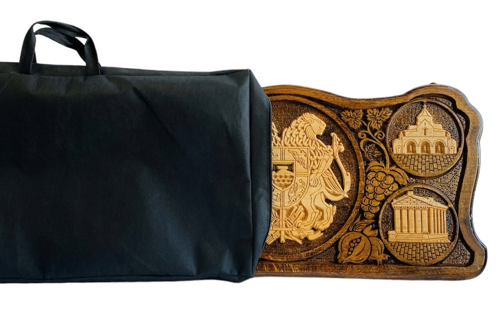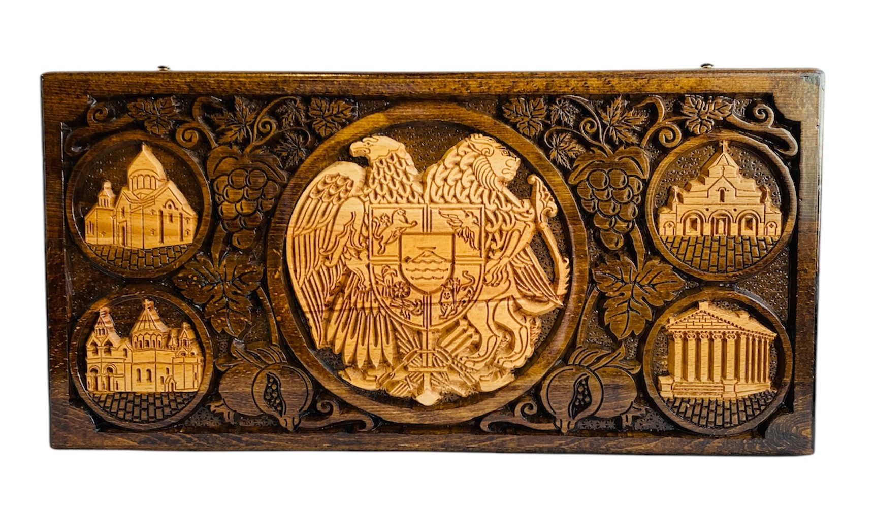 Նարդի փայտե խորը փորագրություն <<ԳԵՐԲ>>։ Չափեր։ 62*30*5,5սմ։ Նարդին պատրաստված է բարձր մշակում անցած փայտից՝ երկկողմանի խորը փորագրությամբ։ Մի կողմոմ պատկերված է գերբ՝ 4 եկեղեցիներով, հակառակ կողմում՝ շախմատ։ Գործում է առաքում։ - Առկայություն: