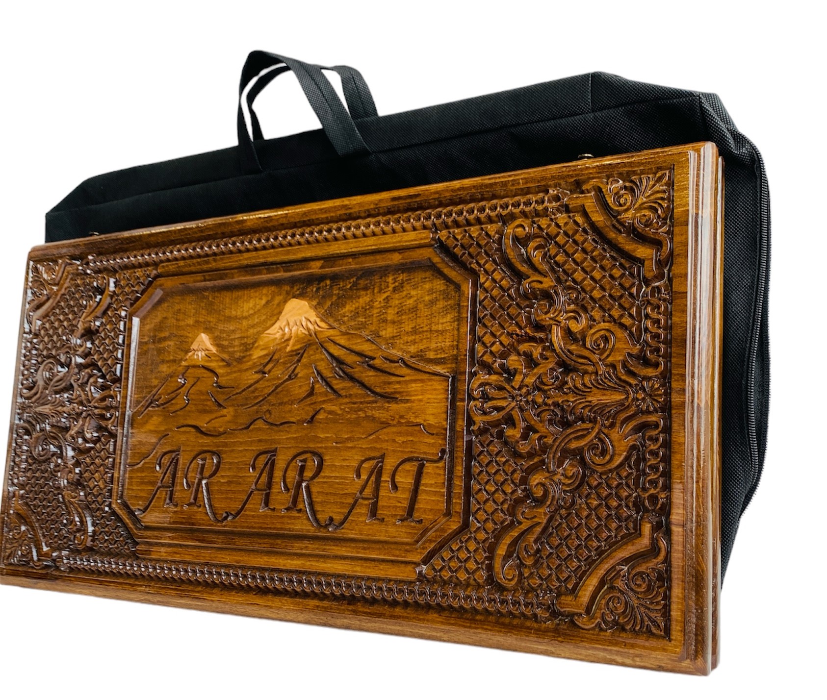 Նարդի փայտե խորը փորագրություն <<ARARAT>>։ Չափեր։ 60*30*4.5սմ։ Նարդին պատրաստված է բարձր մշակում անցած փայտից՝ երկկողմանի խորը փորագրությամբ։ Մի կողմոմ պատկերված է Մասիս սարը՝ ARARAT փորագրությամբ, հակառակ կողմում՝ շախմատ։ Գործում է առաքում։ - Առկայություն: