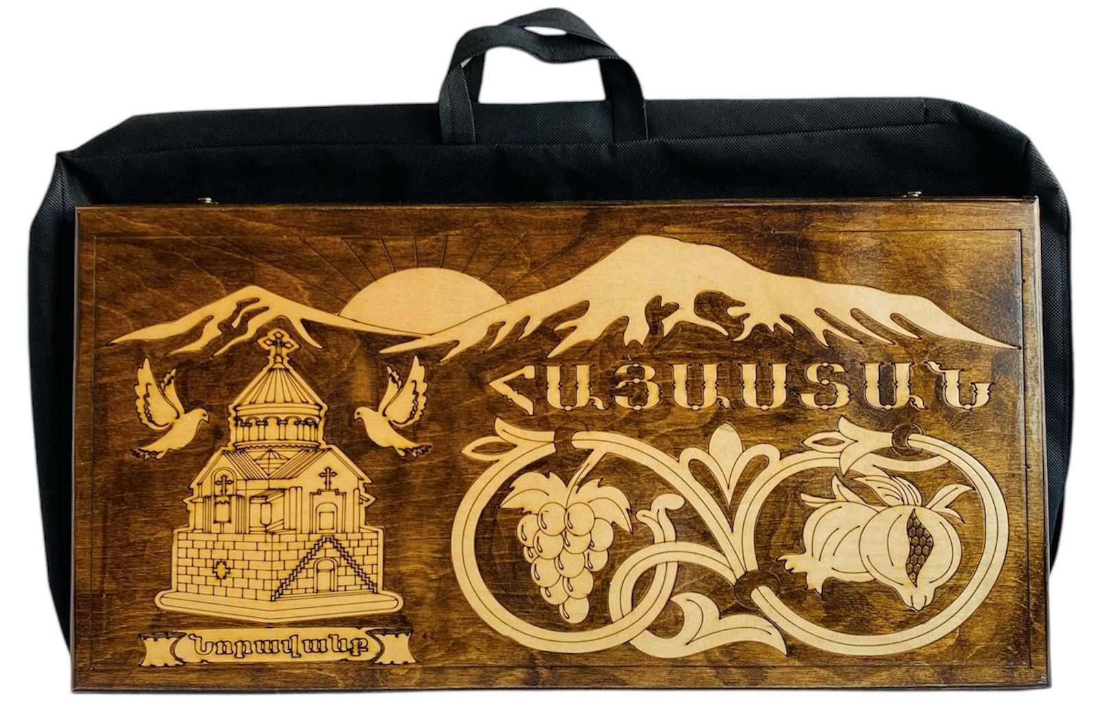 Նարդի փայտային հումք <<ՆՈՐԱՎԱՆՔ>>։ Չափեր։ 60*30*4.5սմ։ Նարդին պատրաստված է փայտային հումքից՝ երկկողմանի պատկերներով։ Մի կողմոմ պատկերված է Նորավանքը և Մասիս սարը, հակառակ կողմում՝ շախմատ։ Գործում է առաքում։ - Առկայություն: