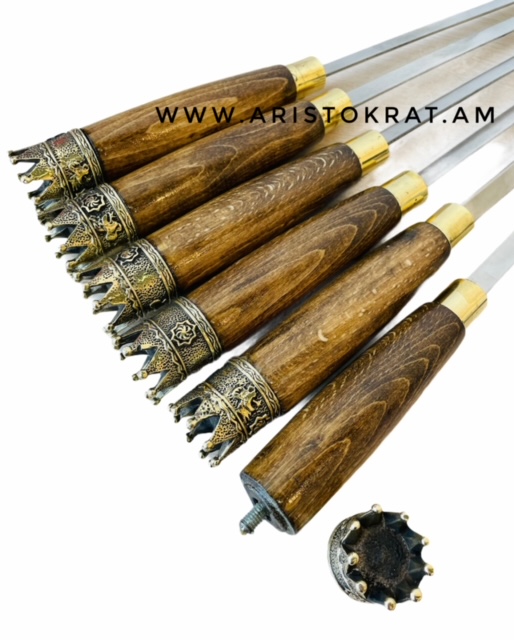 Շամփուր նվերային անվանական փորագրված փայտե պատյանով <<ARISTOKRAT TAG>>, որտեղ ըստ ձեր ցանկության ARISTOKRAT բառի փոխարեն կարող եք պատվիրել ձեր ցանկացած անունը։ Ընդհանուր կոմպլեկտի քաշ՝ 2100գ, կոմպլեկտի չափ՝ 60*1,7*32։ պատյանի հումքը՝ փայտ, պատյանի չափ՝ 42*1,7*32, պատյանի քաշ՝ 900գ, պատյանում թագերով շամփուրների փոխարեն կարող ենք տեղադրել նաև մեր վեբ կայքում ցուցադրված ցանկացած շամփուրի տեսակ գնային տարբերությամբ։ Շամփուրի քաշ՝ 200գ, ընդհանուր երկարությունը՝ 60սմ, աշխատող մասը՝ 40սմ, լիստը մաքուր ներժից է՝ փայլեցված, հաստությունը՝ 2,5մմ։ Շամփուրի բռնակները փայտից են՝ լաքապատ, երկարությունը՝ 20սմ։ ներժի կոլցոներով, գլխիկները՝ ռեզբայով լատունե թագեր։ Գործում է առաքում ամբողջ աշխարհում։